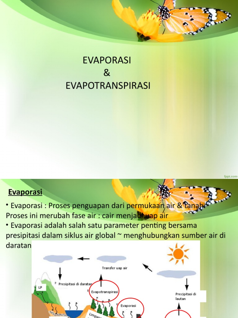 Tahukah Kamu Erosi Evaporasi Evapotranspirasi from sumberdayaair.malangkab.go.id Gerakan yang disebabkan oleh suhu molekul harus cukup untuk mengatasi tegangan permukaan zat dan mencapai proses penguapan. Fenomena alam yang terjadi saling berkaitan antara satu kondisi lingkungan itu sendiri. Mengurangi kadar air dalam makanan sehingga lebih awet. Dapat dimanfaatkan untuk membuat berbagai jenis makanan. Pengertian definis penguapan atau evaporasi adalah proses perubahan molekul dari keadaan cair menjadi gas. Contoh dari evaporasi ini adalah perubahan air menjadi uap air. 9 tahapan siklus hidrologi, evaporasi hingga infiltrasi. Abstrak praktikum transpirasi dan evaporasi dilakukan pada selasa tanggal 05 september 2017 di laboratorium pendidikan 4, universitas andalas.
